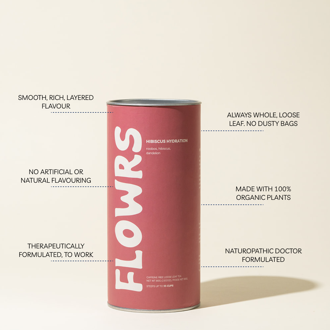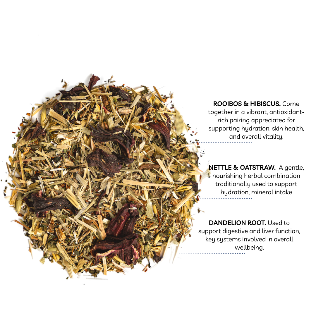 A vibrant caffeine-free herbal blend designed to help you stay hydrated, support radiant skin, and make sipping water feel actually enjoyable. Bright, tangy, and beautifully red, your daily hydration ritual just got delicious. This is skincare meets self-care.