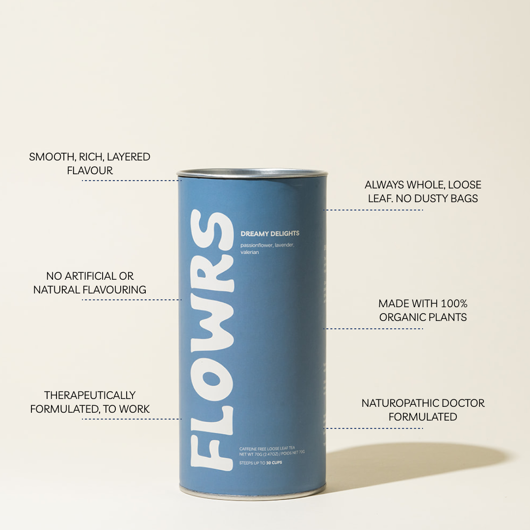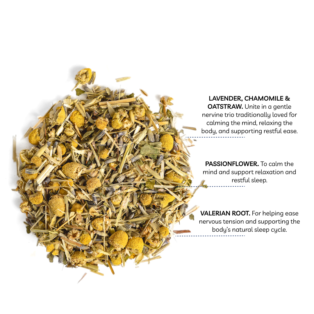 A deeply soothing, caffeine-free herbal blend crafted to help you unwind, soften tension, and settle into slow, dreamy nights. The perfect cup to sip 30–60 minutes before bed.