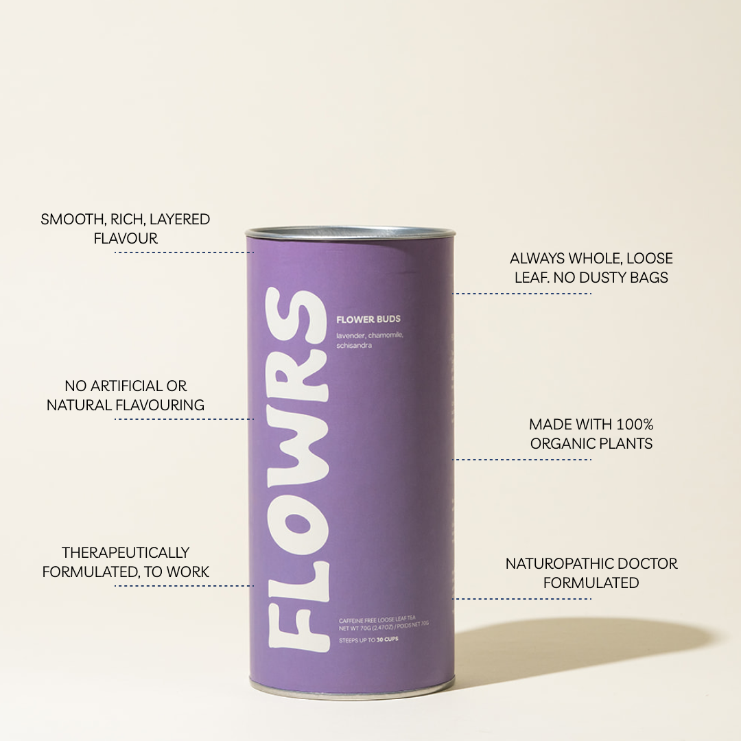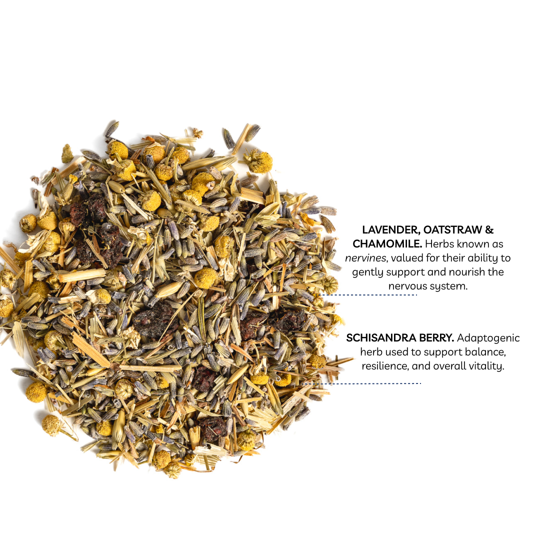 Flower Buds is a soothing, floral-forward herbal tea crafted with lavender, chamomile, oatstraw, and schisandra berry. Designed to help quiet the mind, support rest, and nourish your nervous system.